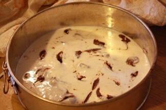 6. Добре змащуємо форму для випічки вершковим маслом. Кладемо у форму шоколадне тісто. Шар тіста заливаємо сирно-бананової сумішшю. Для прикраси чізкейку можна провести хаотичні лінії кінчиком ножа, щоб проявилися прошарку шоколадного тіста.