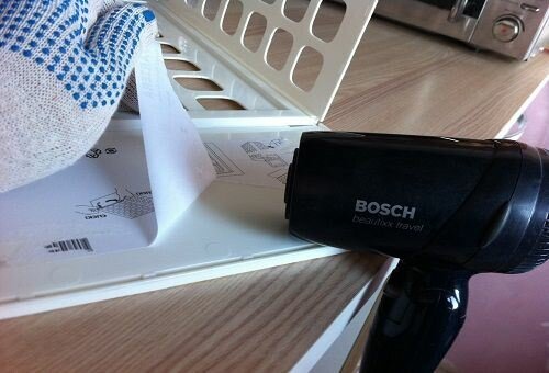- Направляємо на папірець струмінь гарячого повітря від фена і чекаємо півхвилини. Ще раз намагаємося зняти предмет з поверхні пластику. Робимо 2-3 підходи, якщо прогресу немає, переходимо до іншого методу.