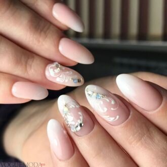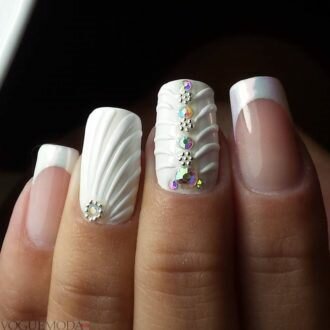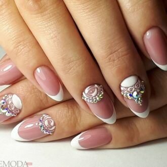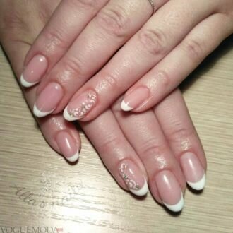 Тенденції по весільному манікюру ознаменувалися посиленням жіночності, витонченості і крихкості його власниці. Навіть, якщо плаття нареченої зшито не з білосніжною тканини, французький манікюр класичного вигляду стане ідеальною прикрасою пальчиків, на одному з яких незабаром має з’явитися нове колечко.