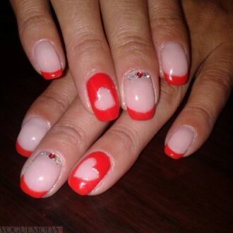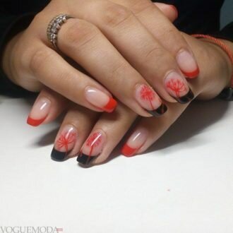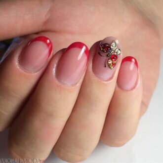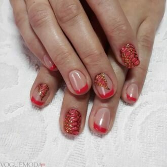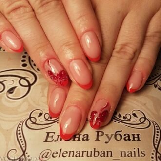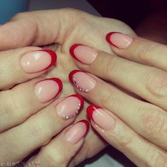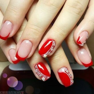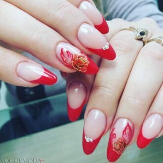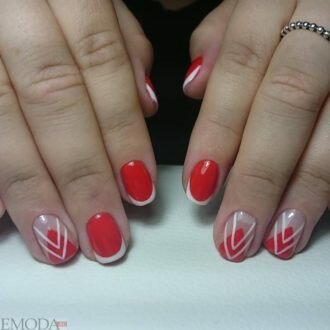 Червоний колір зробив французький манікюр більш пристрасним і сексуальним. Дизайнери вирішили не розкривати всю агресивність кольору, яка йому властива, а знизити її за допомогою романтичних візерунків. Використання цього відтінку навіть тільки на дугах країв нігтів змінює весь образ його власниці.