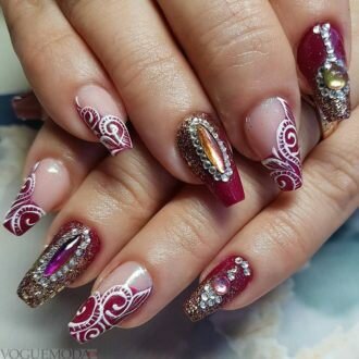 Сексуальний червоний колір манікюру знайшов романтичні штрихи завдяки техніці нейл-арту.