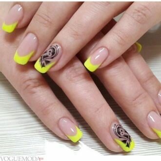 - нігті покриваються яскравим монохромним кольоровим лаком, а фігури промальовувалися чорним;