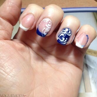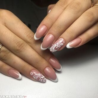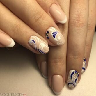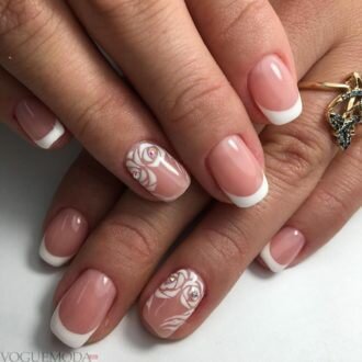 - Візерунки. Ажурні завитки і закарлюки акцентували у «френчі» тільки один-два нігтя, які могли з’являтися на «голої» поверхні або на підготовленої з монохромним лаком.