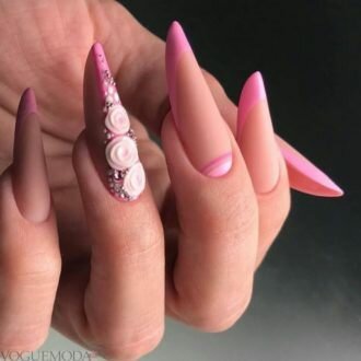 Акцентування одного нігтя квітковим Нейлом, в якому об’ємної ліпленням виділені тільки лінії бутона троянди зроблять ще більш жіночним класичний манікюр, а кольоровому додадуть витончені риси.