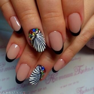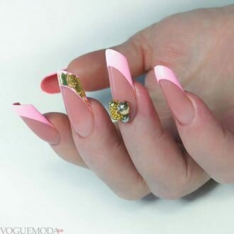 - Нейл-декор. Прикраса стразами, намистинами, блискітками і ліпленням буде використовуватися без фанатизму. Це може бути всього лише одна дуга або прикраса посмішки.