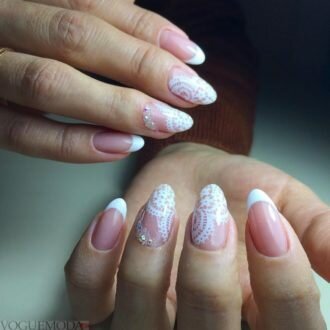 Крім цього дизайнери пропонують прикрасити дугу краю нігтики мереживними візерунками з внутрішньої сторони тим же білим лаком. Актуально і ефектно такий манікюр буде виглядати разом з весільним платтям нареченої, який еже більше підкреслить ніжність і крихкість образу.