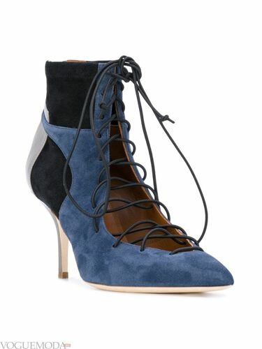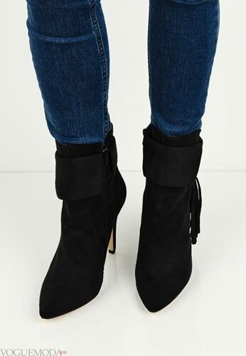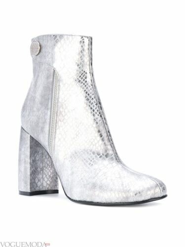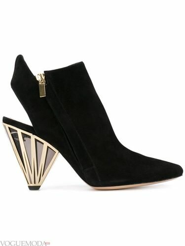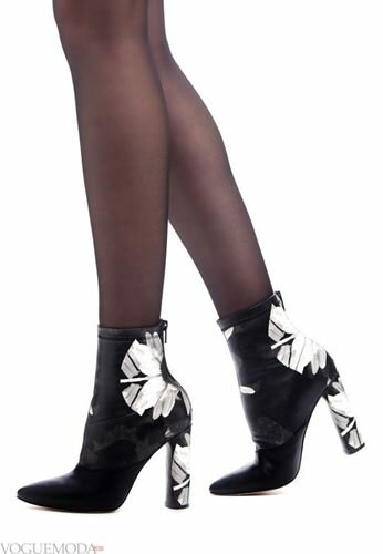 - Ботильйони. Загострений носок і шпилька для ботильонов один зі стандартів. Дизайнери розбавили шаблонність неординарними відтінками. Золотистий і сріблястий кольори виглядали яскраво в своєму єдиному виконанні, так і в поєднанні з чорним.