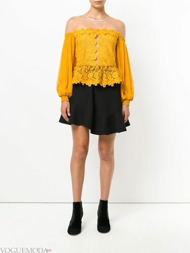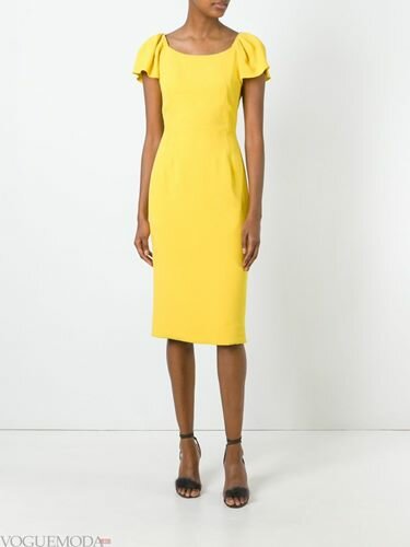 Органічно в насичено жовтому кольорі виглядає органза, з якої шиють вечірні сукні та ошатні костюми. З таким одягом найкраще поєднувати легку шкіряну взуття: босоніжки, сандалі і човники.