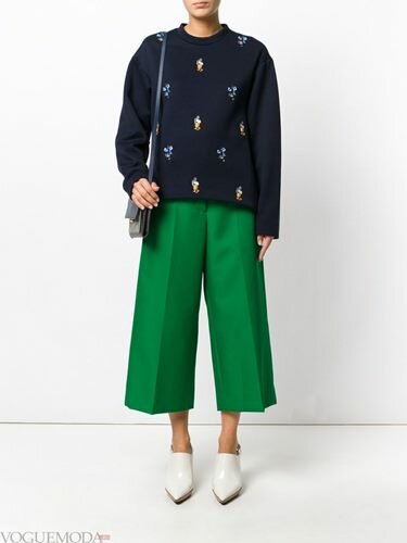 - Зелений. Такий колір дозволить підкреслити всю елегантність і вишуканість образу. Стилісти рекомендують звернути увагу на поєднання брюк темно-зеленого кольору, і синьою футболки.