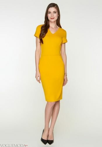 - Жовта сукня міді з акцентом на талії.