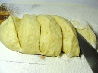 3 Після того, як тісто полежить, його потрібно вимісити ще разочок і розділити на п’ять рівних частин. Кожну частину скачуємо в невеликий шар.