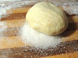 4 Дощечку припылим трохи борошном і викладемо на неї гіркою 3 ст. л. цукру. На цю гірку укладаємо одну частину тіста і розгортаємо в пласт діаметром близько 20 див. Працювати потрібно так, щоб нижній шар був повністю покритий цукром.