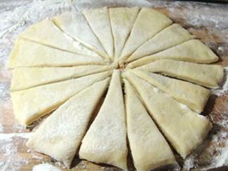 5 Цей пласт ми розрізаємо на 12 – 16 сегментів, з яких потрібно скрутити міні–рогалики. Все те ж саме робимо і з іншими частинами тесту.
