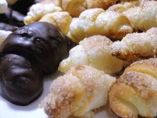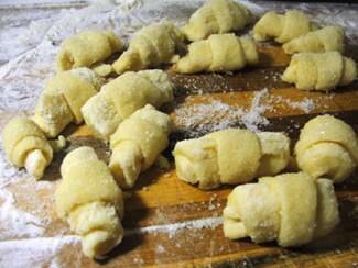 6 За бажанням, можна не використовувати цукор, а покласти начинку. Також можна обваляти рогалики в пудрі або ж занурити в шоколад, в останніх двох випадках пласт тіста розкачати без вживання цукру.